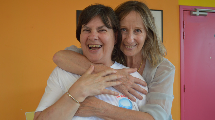 Nathalie a 52 ans. Elle vit à la Maison Jeanne d’Arc depuis 1992. Aujourd’hui, deux de ses sœurs sont présentes, dont Maryse, sa tutrice. Dans un sourire empli de tendresse, Maryse regarde sa sœur et explique « Elle a toujours été très bavarde. Elle vieillit physiquement mais elle ne change pas dans sa tête. Elle s’amuse toujours des mêmes petites choses ».