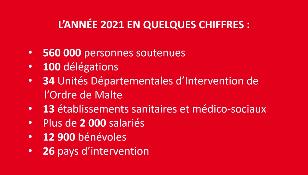 Solidarité, secourisme, sanitaire et médico-social en France, santé de la mère et de l’enfant, combat contre la lèpre, etc. à l’international, 2021 a assisté au renforcement des actions déjà existantes de l’Ordre de Malte France (maraudes sociales, maraudes Soli’Malte…) ainsi qu’à une dynamique de rassemblement de tous les moyens nécessaires pour en créer de nouvelles (antennes médicales mobiles, food-trucks, centres de soins…).