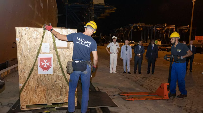 Fin septembre, tout est prêt pour que le matériel soit acheminé depuis Dreux jusqu’au port militaire de Toulon (83). Le personnel de l’Ordre de Malte France remet le matériel au Commandant du porte-hélicoptères amphibies, le Dixmude. Le débarquement des trois palettes de matériels a lieu le 7 novembre.