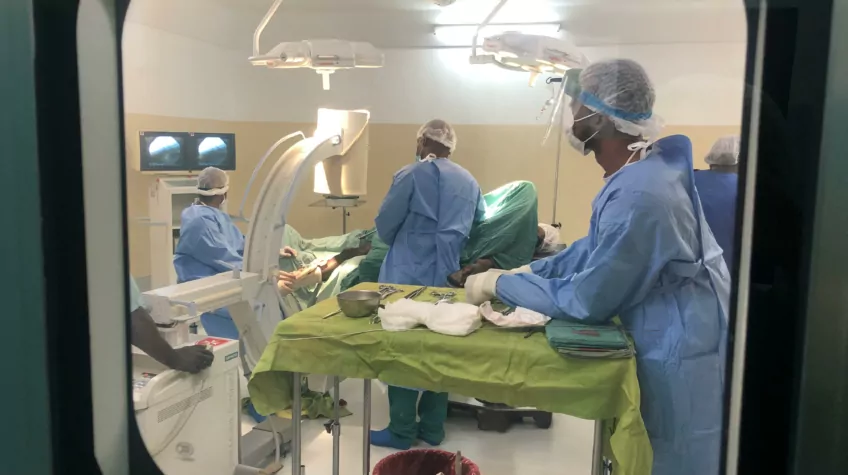 Le premier patient qui y a été opéré est un homme d’une cinquantaine d’années. Il a été reçu suite à un accident de moto. L’hôpital étant situé près d’une route nationale particulièrement dangereuse, les accidents font partie du quotidien du personnel de l’établissement. Accueilli aux urgences quelques jours auparavant en présentant une fracture du tibia, le blessé, salarié de la plantation de bananes voisine, a été pris en charge efficacement. L’enjeu de son intervention chirurgicale : faire passer un clou dans le tibia afin de réduire la fracture pour consolider l’os.