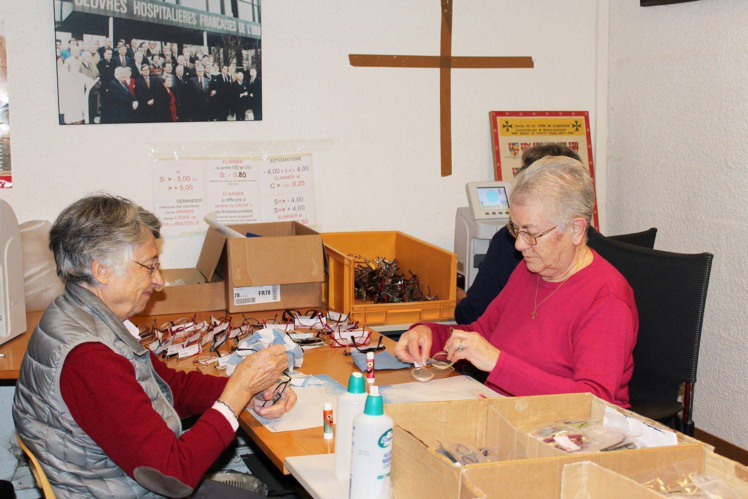 Nos bénévoles effectuent un tri de paires de lunettes dans 5 de nos centres en France (Aix-en-Provence, Clamart – près de 125 000 paires triées en 2018 –, L’Isle-Adam, Versailles – près de 200 000 paires triées par an – et Saint Etienne) afin de les trier, nettoyer, mesurer, étiqueter, parfois réparer, puis de les envoyer au centre logistique situé à Bois-d’Arcy (78).