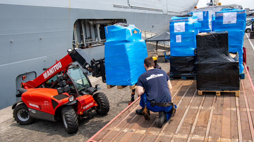 Les 16 palettes de matériel paramédical livrées à quai, à Abidjan par la Marine nationale. Crédit armée française.