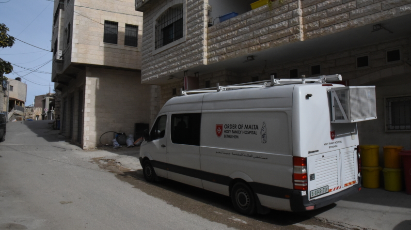 Le véhicule qui transporte la clinique mobile de l’hôpital de la Sainte-Famille, en Palestine. Crédit photo : Ordre de Malte France.