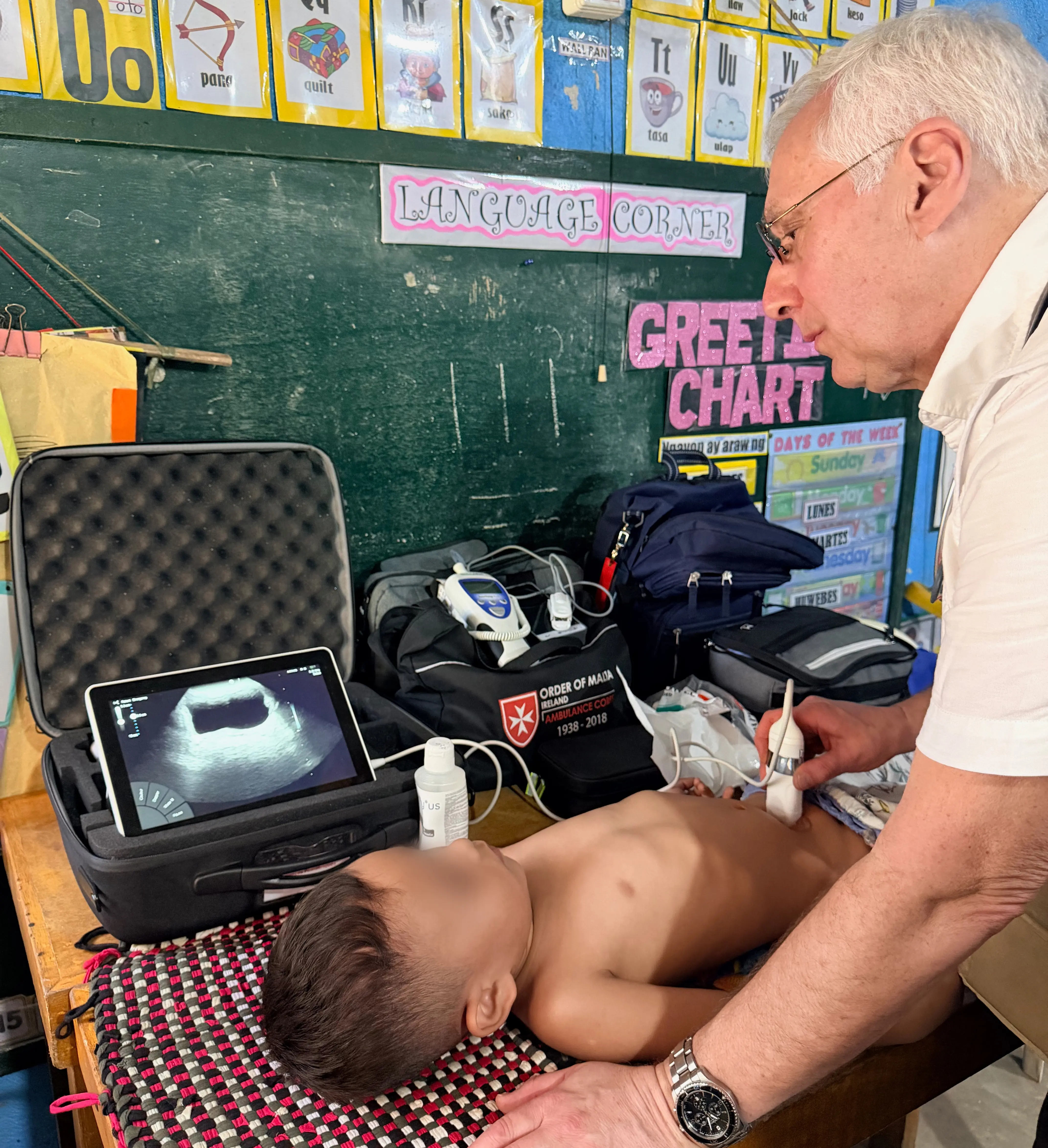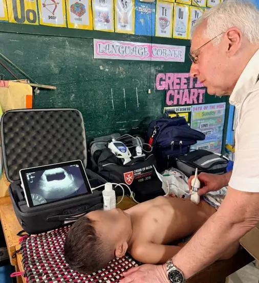 Le Docteur Pierre Tandonnet pratiquant une échographie. Crédit photo : Ordre de Malte France.