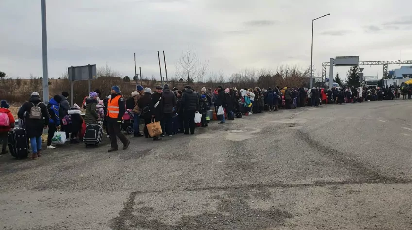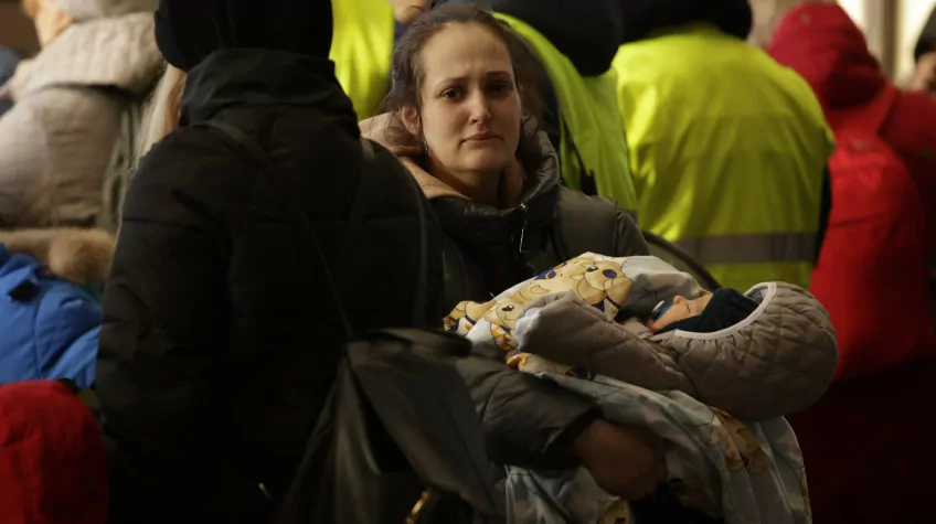 8 : Ukraine. Les réfugiés sont exclusivement des femmes et des enfants. On peut lire la peur et la tristesse sur le visage de cette femme qui porte son enfant.