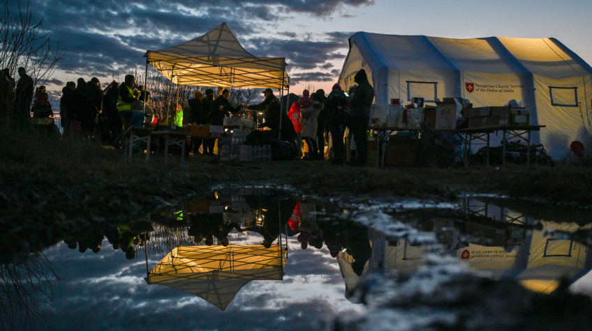 2 : Hongrie. Un camp de réfugiés à la tombée de la nuit. L’Ordre de Malte distribue du matériel (tentes, couvertures, denrées alimentaires…) afin d’aider au mieux les réfugiés.