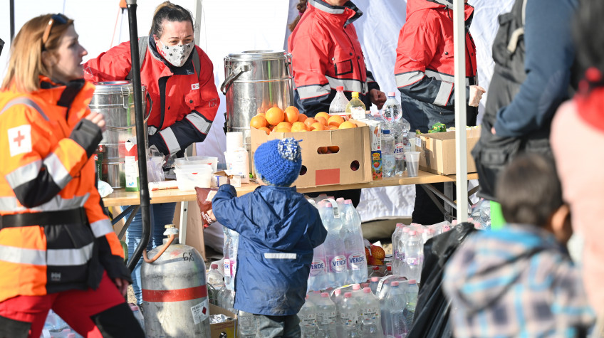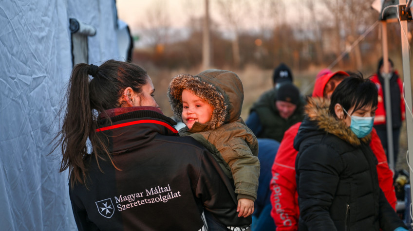 3 : Hongrie. Une bénévole hongroise de Malteser International prend soin d’un petit garçon ukrainien. Un échange remplit de douceur se dessine sur leurs visages.