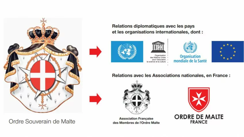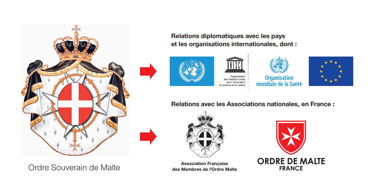 Ordre religieux et laïc de l’Église catholique depuis 1113 et sujet de droit public international, l’Ordre Souverain de Malte possède sa propre constitution, ses propres institutions et émet des passeports et des timbres. Il est neutre, impartial et apolitique, et entretient des relations diplomatiques avec plus de 110 pays. Il dispose d’un siège d’observateur permanent auprès des Nations Unies, ses agences spécialisées et auprès de nombreuses organi­sations internationales. L’Ordre Souverain de Malte œuvre dans plus de 120 pays à travers 10 Prieurés, 50 Associations natio­nales, 133 missions diplomatiques, une agence de secours internatio­nale et 33 corps de secours nationaux, grâce à 52 000 professionnels, 100 000 bénévoles et à travers des nombreux hôpitaux, centres médicaux et fondations spécialisées.