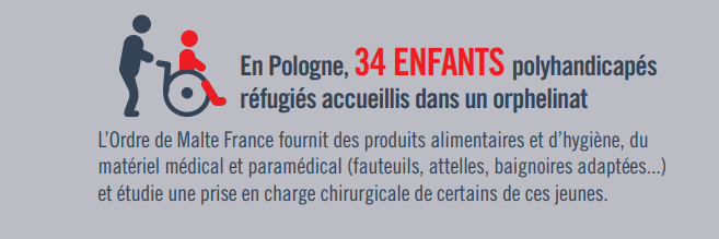 Dans le contexte de la guerre en Ukraine, l’Ordre de Malte France soutient financièrement 6 associations de l’Ordre de Malte (Pologne, Slovaquie, Hongrie, Roumanie, Lituanie et Belgique) dans la mise en place de leurs projets d’aide aux réfugiés Ukrainiens. L’OMF soutient également un centre en Pologne qui accueille des jeunes réfugiés Ukrainiens polyhandicapées.