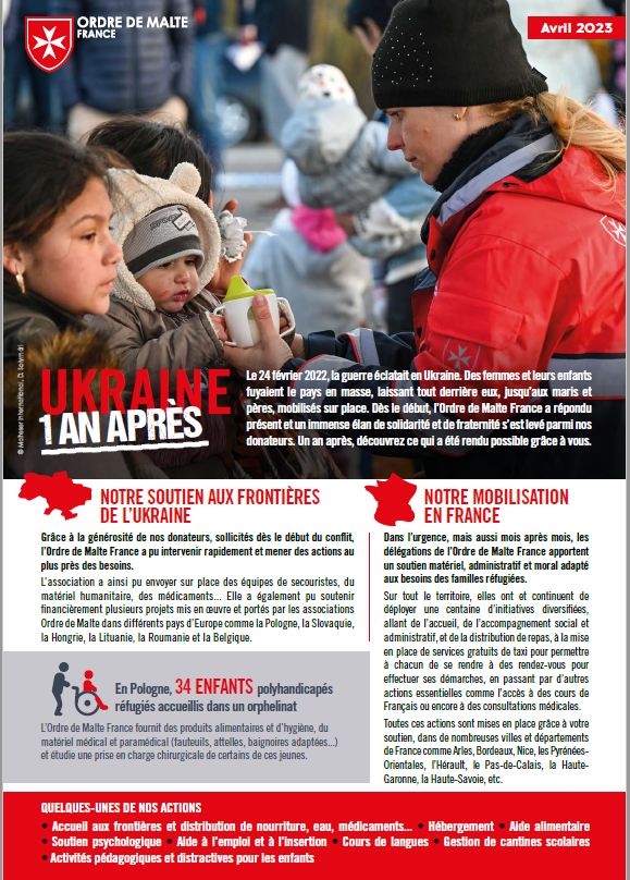 Le 24 février 2022, la guerre éclatait en Ukraine. Des femmes et leurs enfants fuyaient le pays en masse, laissant tout derrière eux, jusqu’aux maris et pères, mobilisés sur place. Dès le début, l’Ordre de Malte France a répondu présent et un immense élan de solidarité et de fraternité s’est levé parmi nos donateurs. Un an après, découvrez ce qui a été rendu possible grâce à vous.