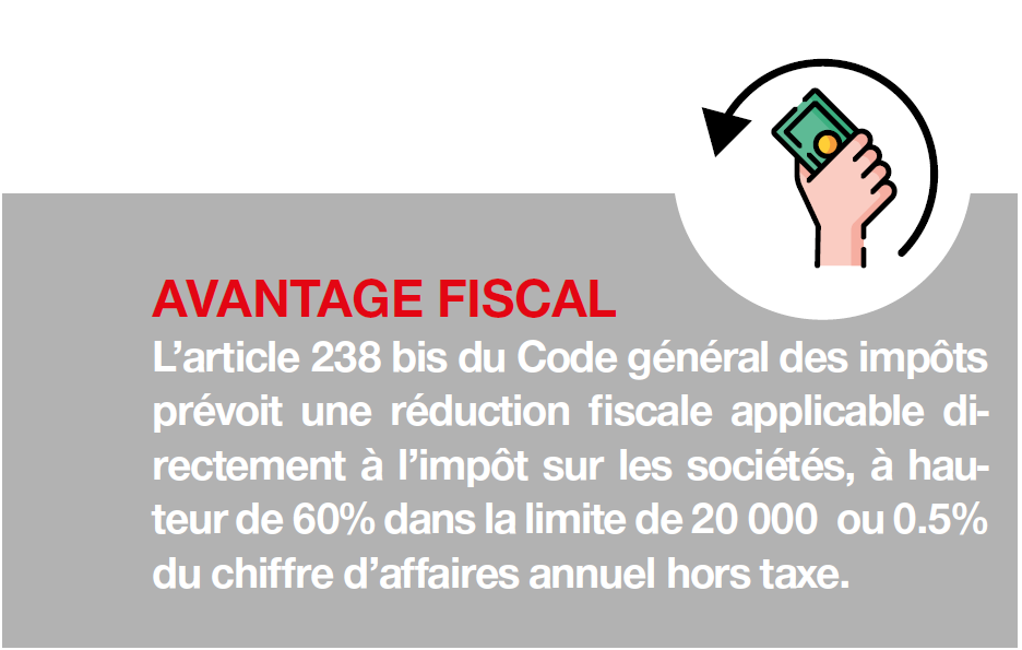 L’article 238 bis du Code général des impôts prévoit une réduction fiscale applicable directement à l’impôt sur les sociétés, à hauteur de 60% dans la limite de 20 000 € ou 0,5% du chiffre d’affaires annuel hors taxe.