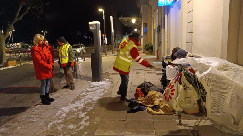 Le délégué Michel Casorla explique le contexte : « Notre équipe de 4 à 5 bénévoles sillonne la ville le mercredi soir, pour être complémentaire avec les deux maraudes de la Croix-Rouge. Cette coopération interassociative permet aux personnes à la rue de bénéficier d’un soutien régulier. J’ai d’ailleurs effectué deux tournées au préalable avec la Croix-Rouge, pour bien repérer le circuit, les besoins… Nous sommes aussi en lien avec le 115, que nous appelons avant le départ, pour récupérer leurs appels de la journée. Ils peuvent nous contacter en cas d’urgence pendant la soirée ». Les bénévoles distribuent des boissons chaudes, des denrées sèches et, selon les dons reçus, des vêtements chauds, sacs à dos, couvertures, kits hygiéniques… transportés dans le véhicule donné par le Siège. Ils rencontrent en général 10 à 15 personnes.