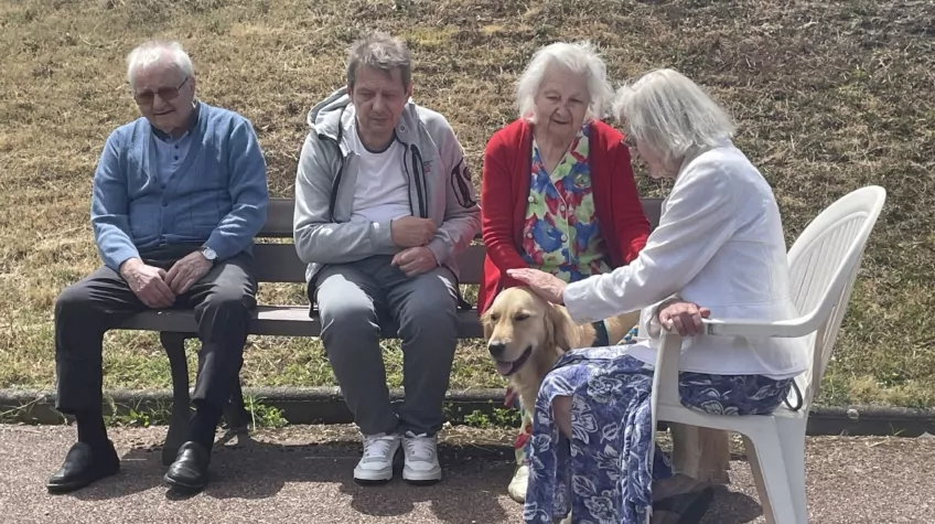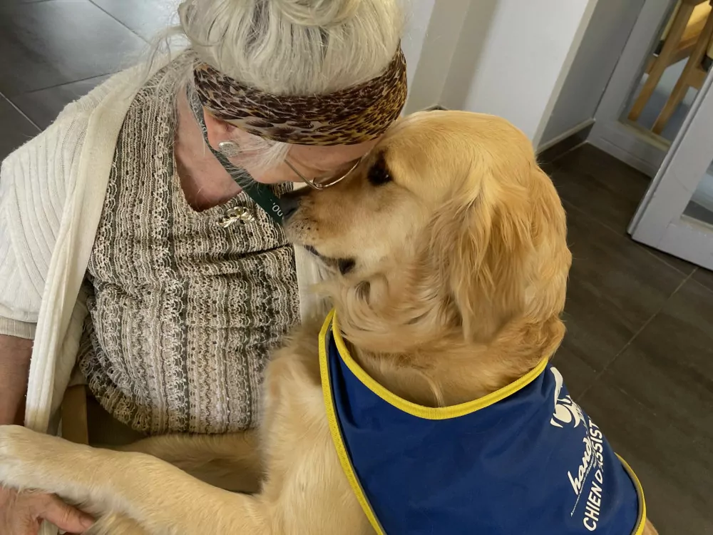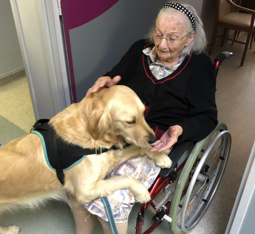 Depuis quelques semaines, les résidents de l’EHPAD Saint-Paul (Saint-Etienne, 42) ont la joie de compter parmi eux une nouvelle résidente. Elle se déplace à 4 pattes et raffole de câlins. Reine, un golden-retriever dressé tout spécialement depuis deux ans pour tenir compagnie aux personnes âgées, prend progressivement sa place au sein de l’établissement.