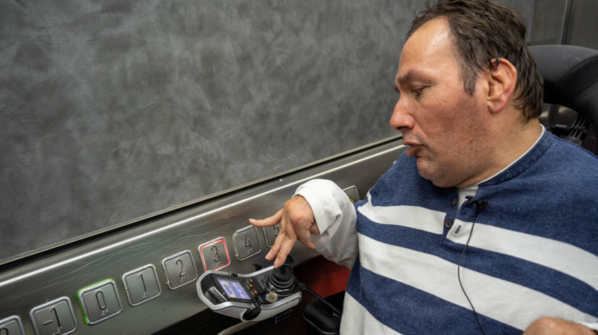 Pour se déplacer, Xavier, l’un plus anciens résidents de l’établissement, utilise un fauteuil équipé de domotique, c’est-à-dire de capteurs et systèmes capables de s’adapter à son autonomie résiduelle. Il nous accompagne dans l’unique ascenseur fonctionnel équipé en domotique à la MAS.