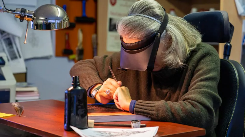 Concentrée, les mains serrées, elle se plonge dans une gravure qu’elle a presque terminée. « J’ai du mal au niveau des mains », commente-t-elle en même temps. Tout passe par le mouvement de ses épaules. « Parfois, je dépasse un peu, en faisant un petit mouvement brusque (…) C’est un travail minutieux », explique-t-elle très posément.