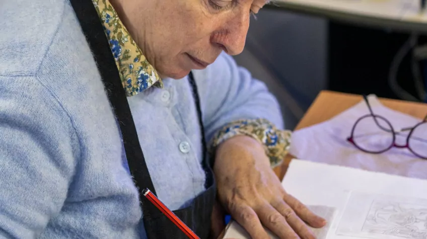 Axelle vit à la MAS depuis plus de 20 ans. Elle est l’une des -si ce ne n’est la- résidente(s) la plus assidue. À l’heure pile, on la voit arriver sur son fauteuil électrique, calme et sereine. « J’ai commencé la gravure en 2007 à l’époque où des résidents de l’établissement se rendaient au Musée Carnavalet, puis au Petit Palais », raconte-t-elle. « Ensuite, j’ai voulu que la gravure entre à la MAS », poursuit-elle, en prenant le temps de positionner son fauteuil derrière une table, dont la hauteur a été étudiée spécialement pour elle.