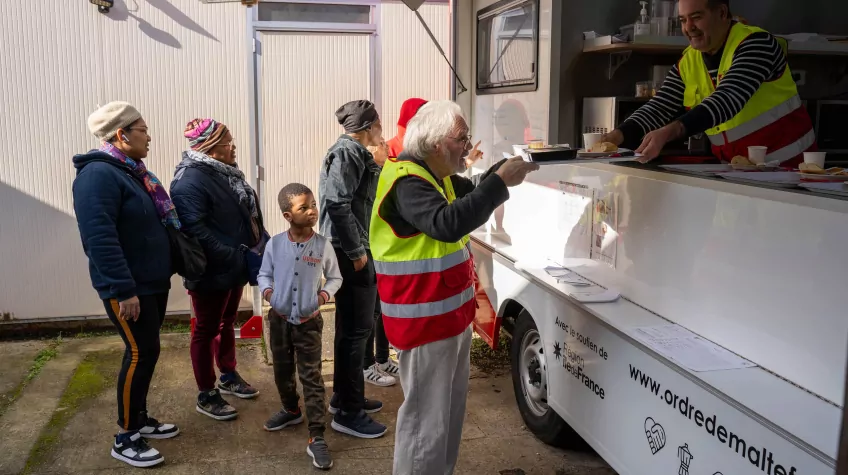 Tous les samedis à Montfermeil, en Seine Saint-Denis, des personnes en situation de précarité se rendent au point de stationnement du foodtruck solidaire de l’Ordre de Malte France. Grâce aux bénévoles qui s’engagent sur ce dispositif, elles bénéficient d’un repas gratuitement. Cette initiative est financée par la région Île-de-France.