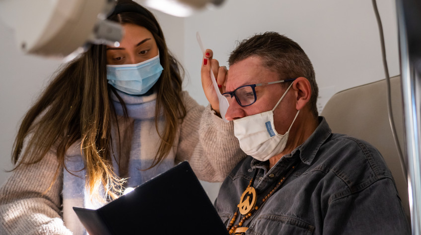 « Vous allez me lire à chaque fois la ligne la plus petite possible ». La liste des vérifications à faire en début de consultation bien en tête, Mathilde, élève en deuxième année à l’AEPO, met son patient en confiance. Le patient, c’est Alain. Avant « la galère », celui-ci a occupé des postes importants, notamment au sein d’une compagnie aérienne pour laquelle il a travaillé pendant 25 ans. Mais ça, c’était avant son « accident de vie ».