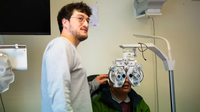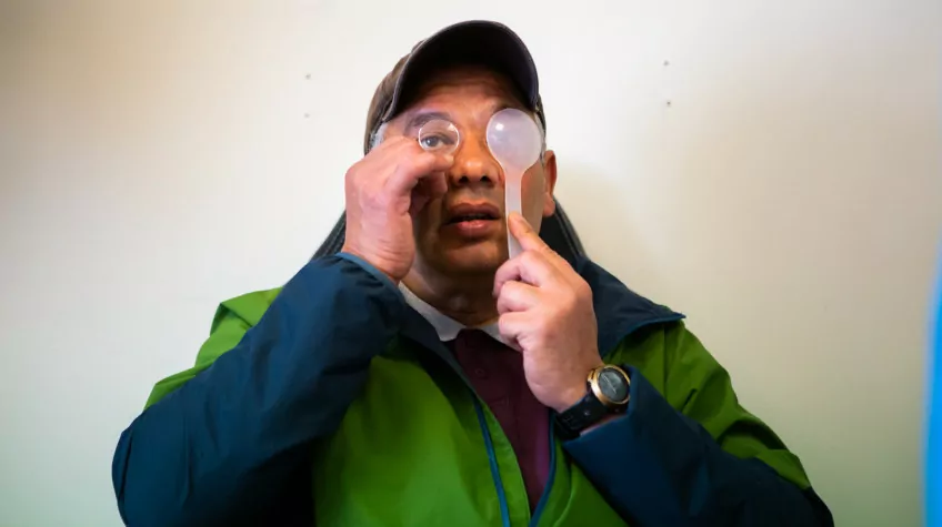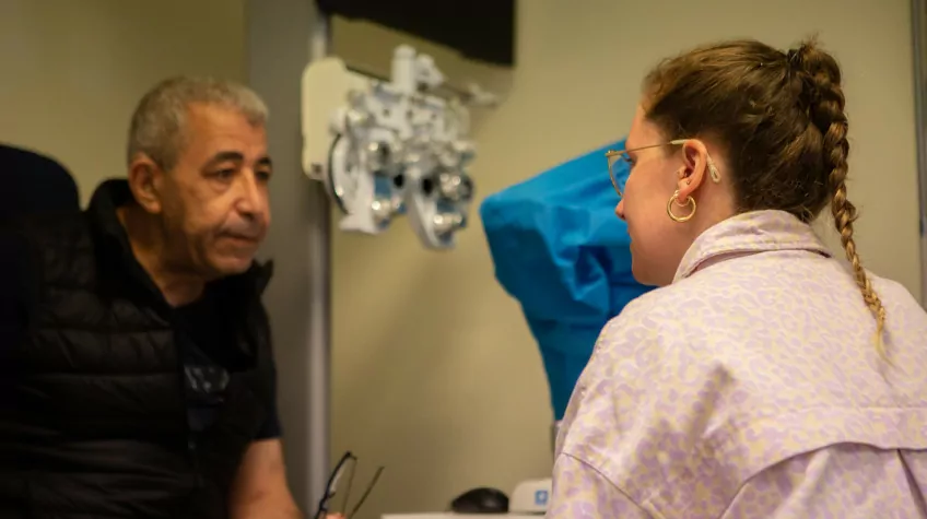 Avant de commencer la visite, quelques questions sont nécessaires. Nikita demande ainsi à un bénéficiaire : « Quel est votre nom ? », « Qu’est-ce que vous faites dans la vie ? », « Comment vous sentez-vous avec vos lunettes actuelles ? », etc. Mustapha, 61 ans, retraité mais toujours actif, se prête au jeu des questions réponses.