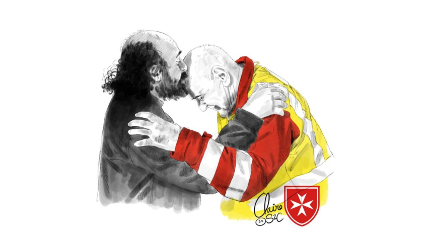 Suite au succès de cette première expérience, Claire a cette fois-ci découvert les maraudes médicales. Elle a fait la rencontre de Guy, médecin retraité de 70 ans, connu pour sa bienveillance et son dévouement depuis de nombreuses années aux côtés de l’Ordre de Malte France. Au détour d’une consultation improvisée, l’un des sans-abris qu’il venait de soigner lui a déposé un baiser sur le front, dans un élan d’émotion spontanée. Une scène que Claire a immortalisée dans un dessin plein de tendresse et de profondeur.